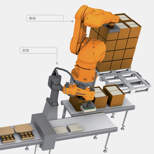 公司集成庫卡,ABB,安川,發那科各種應用機器人,拆碼垛解決方案無需休息,節省環節,同時直接對應目標傳送帶。并且可以實現WCS信息無縫對接,無人化,更安全,適用于各行業的倉儲系統、生產制造、電商、物流配送等。